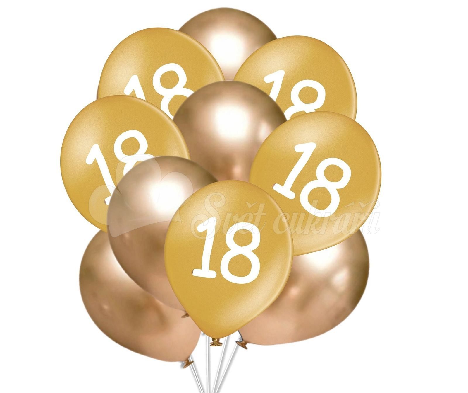 Balloons 18 birthday gold 10 pcs 30 cm mix In the package there are 5 x pcs of gold metallic balloons with printed number and 5 x pcs of gold chrome balloons.