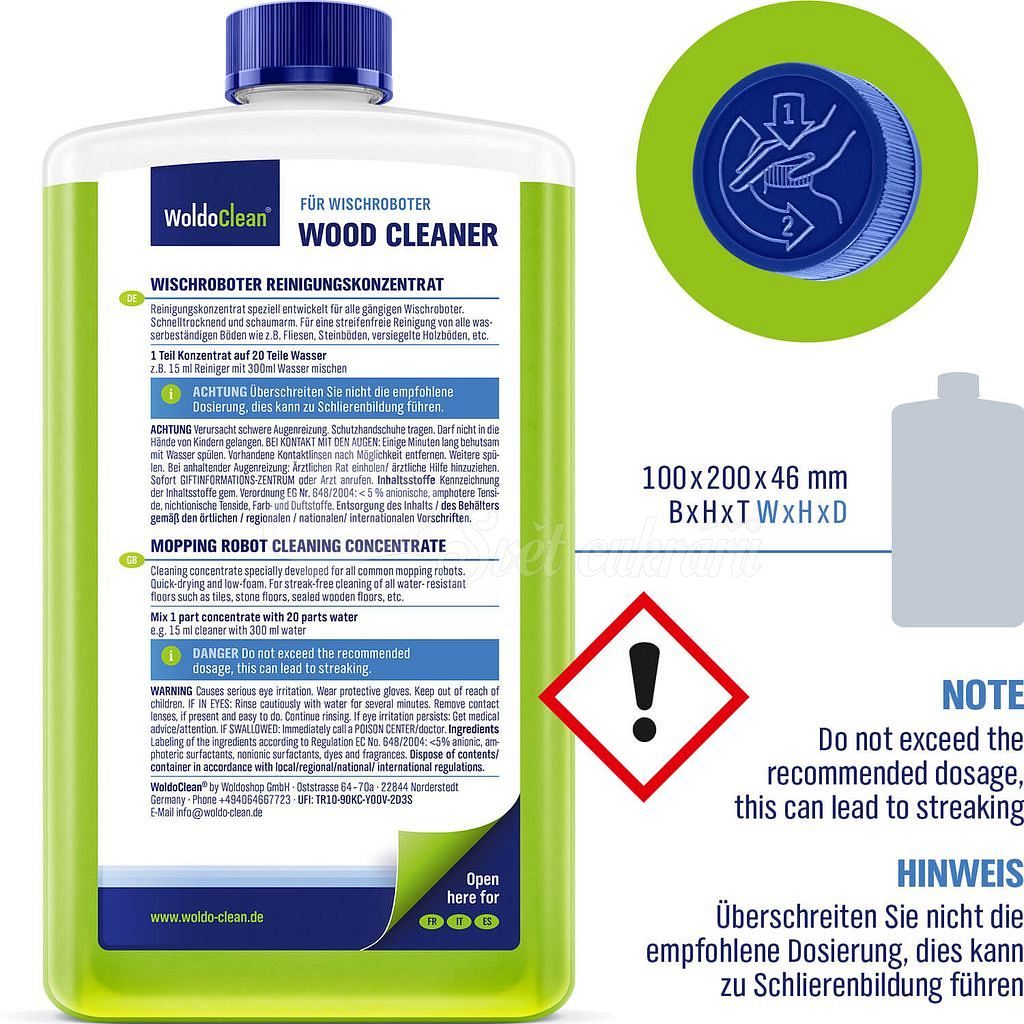 This cleaning agent for robots is specially developed for easy and quick removal of tough dirt and grease from all types of floors such as wooden, stone, PVC, or linoleum. It leaves your floor clean and shiny without streaks, with a pleasant fresh lemon scent.
