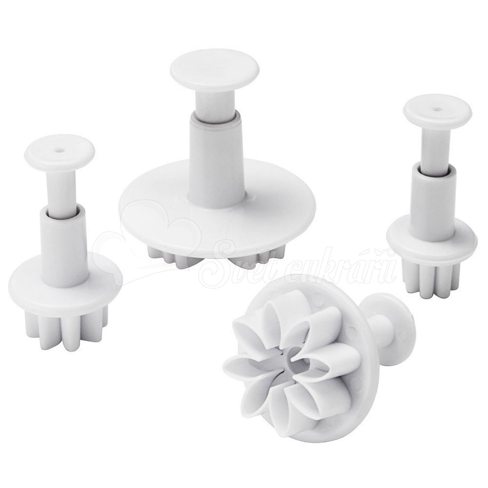 A set of plunger cutters in the shape of moon daisies. The pack contains 4 pc. Size of blossoms: 1.5 cm, 2 cm, 2.5 cm and 3.5 cm.