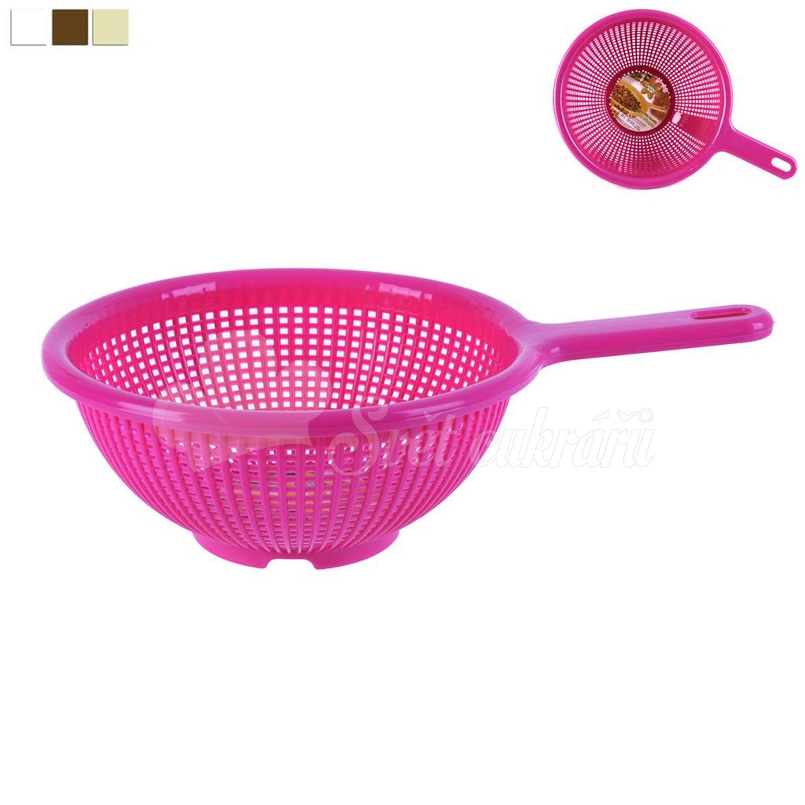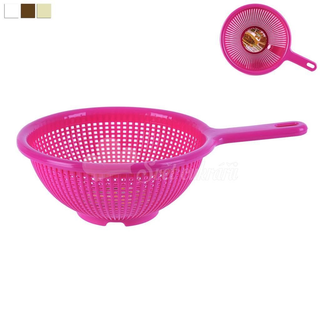 Plastic colander with a diameter of 21 cm with handle and loop for hanging.