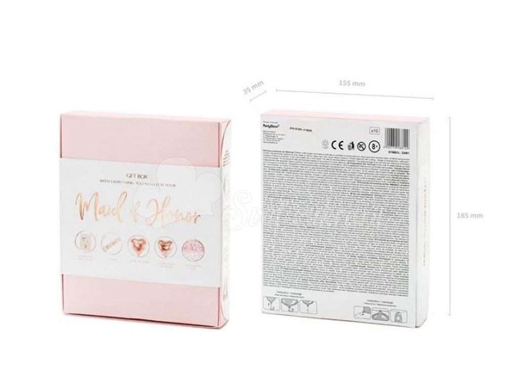 Inside the box, you will find 1× elegant sash that will perfectly complement the bridesmaid's dress, along with 1× card and bracelet as a thoughtful personal gift. The Heart Foil Balloon in trendy rose gold adds a delightful touch to the overall aesthetic of the event.